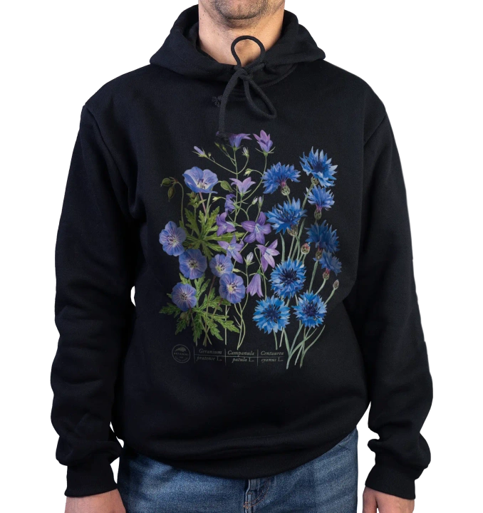 - Premium hoodie with a floral motif sewn in a local sewing room from a draped knit fabric made in Poland. Large, durable and clear print made with modern DTF technology. Knitted fabric composition: 80% cotton, 20% polyester.