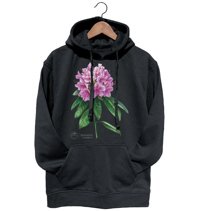 Cotton hoodies with a purple rhododendron flower motif will please the eye of all lovers of these spectacular plants. They are perfect for cooler days outdoors. Catawba rosebay, native to the shady forests of North America, needs acidic soil (pH 4-5.5) and little sun to fully bloom. This heath, brought to Europe in the 19th century, tolerates frost very well, but its delicate physiognomy is very sensitive to strong winds. This unique plant is a species-protoplast of many prized garden varieties, so it is the original from which inspiration was drawn in creating new varieties.