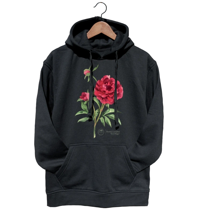 Cotton hoodies with a dark red peony flower motif will please the eye of all lovers of these charming plants. They are perfect for cooler days outdoors. Red chinese peonies are characterized by huge, ruby-colored inflorescences that ooze fragrance. They bloom in June, in warm sunshine, although their dual nature ensures that they are fully frost hardy. Red magic needs slightly moist soil and not too deep roots to develop its full charm. Peonies are characterized by their longevity, but unlike many older ladies, they like to be repotted to new locations so they can bloom as spectacularly as they did in their younger years.