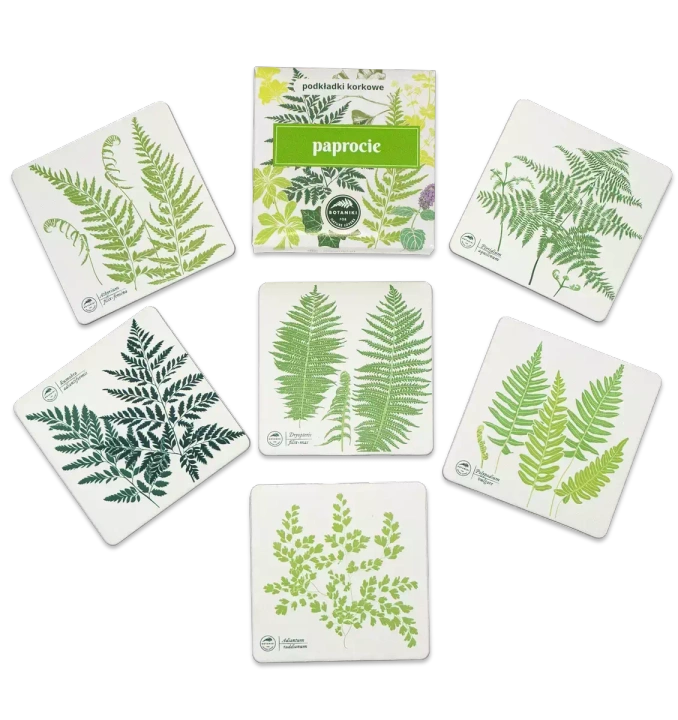 - A set of 6 pieces of cork coasters measuring 10x10 cm. Cork coasters with illustrations of ferns are a great gift idea for a forest lover. The coasters are 3 mm thick, made of a layer of cork and cardboard, with a matte film on top.