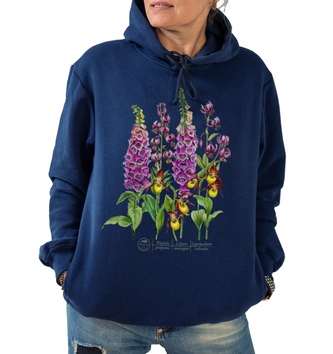 - Premium hoodie with a floral motif sewn in a local sewing room from a draped knit fabric made in Poland. Large, durable and clear print made with modern DTF technology. Knitted fabric composition: 80% cotton, 20% polyester.