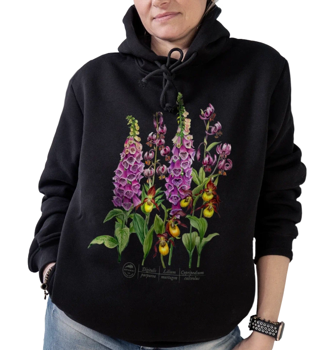 - Premium hoodie with a floral motif sewn in a local sewing room from a draped knit fabric made in Poland. Large, durable and clear print made with modern DTF technology. Knitted fabric composition: 80% cotton, 20% polyester.