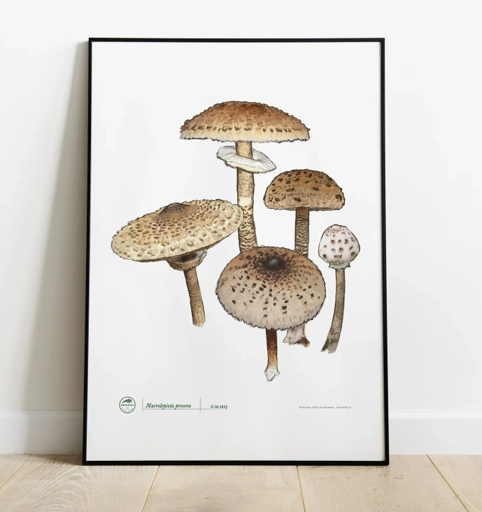 Parasol mushroom is a large edible mushroom in the mushroom family, prized for its delicate flavour and aroma. It is characterised by a large cap between 10 and 40 cm in diameter, covered with brown scales, and a white-brown stem that can grow up to 40 cm in height. Young fruiting bodies resemble brown or flesh-coloured balls, while adult fruiting bodies are hat-shaped.