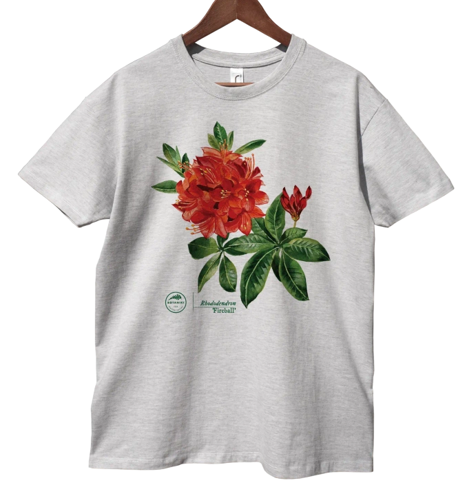 T-shirts with a large-flowered azalea flower motif will please the eye of all lovers of these spectacular plants. The genus Rhododendron brings together many species of plants. Depending on the species, they can be characterized by evergreen or seasonal foliage. The flowers of the large-flowered azalea of the 'Fireball' variety are a beautiful dark orange color and appear in May. They grow most magnificently in shady or semi-shaded places in humus, permeable, slightly acidic soil (pH 4-5,5). Plants shed their leaves for the winter.