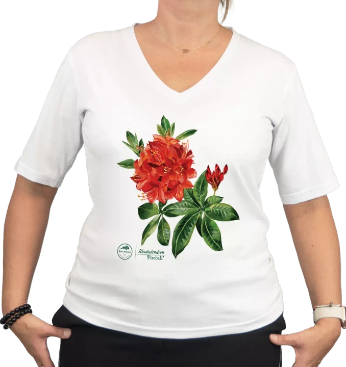 T-shirts with a large-flowered azalea flower motif will please the eye of all lovers of these spectacular plants. The genus Rhododendron brings together many species of plants. Depending on the species, they can be characterized by evergreen or seasonal foliage. The flowers of the large-flowered azalea of the 'Fireball' variety are a beautiful dark orange color and appear in May. They grow most magnificently in shady or semi-shaded places in humus, permeable, slightly acidic soil (pH 4-5,5). Plants shed their leaves for the winter.