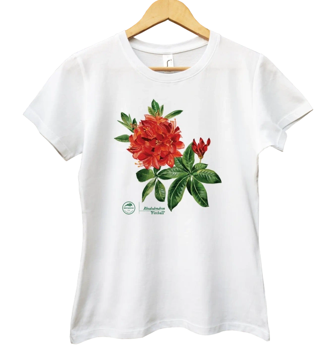 T-shirts with a large-flowered azalea flower motif will please the eye of all lovers of these spectacular plants. The genus Rhododendron brings together many species of plants. Depending on the species, they can be characterized by evergreen or seasonal foliage. The flowers of the large-flowered azalea of the 'Fireball' variety are a beautiful dark orange color and appear in May. They grow most magnificently in shady or semi-shaded places in humus, permeable, slightly acidic soil (pH 4-5,5). Plants shed their leaves for the winter.