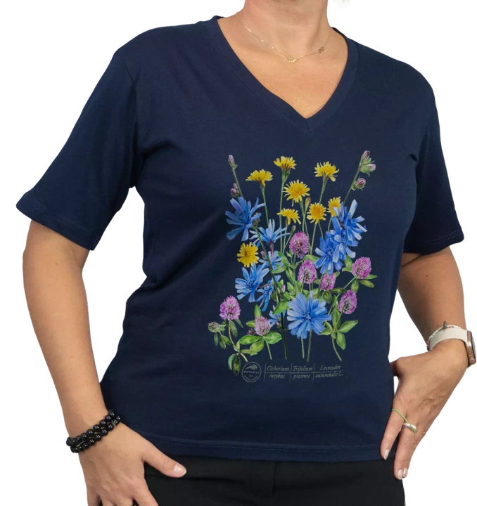 - Women's t-shirt of classic cut with a pointed neckline. 100% cotton. 180 g weight. Regular cut. Sewn in Poland. Premium product.
